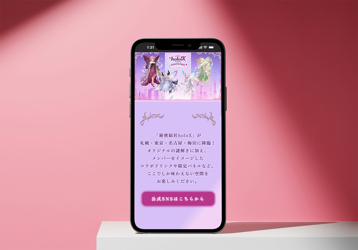 2025年12月4日(水)〜2026年1月4日(日)まで、北海道・東京・名古屋・大阪の4都市で開催される「秘密結社holoX tower invasion 〜holoX色に染め上げろ!〜」の特設Webサイトを制作しました。
