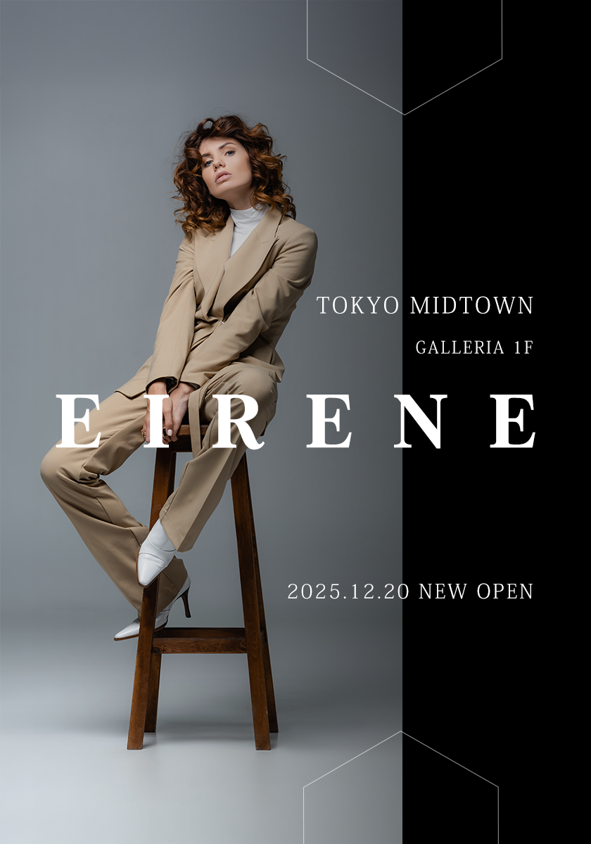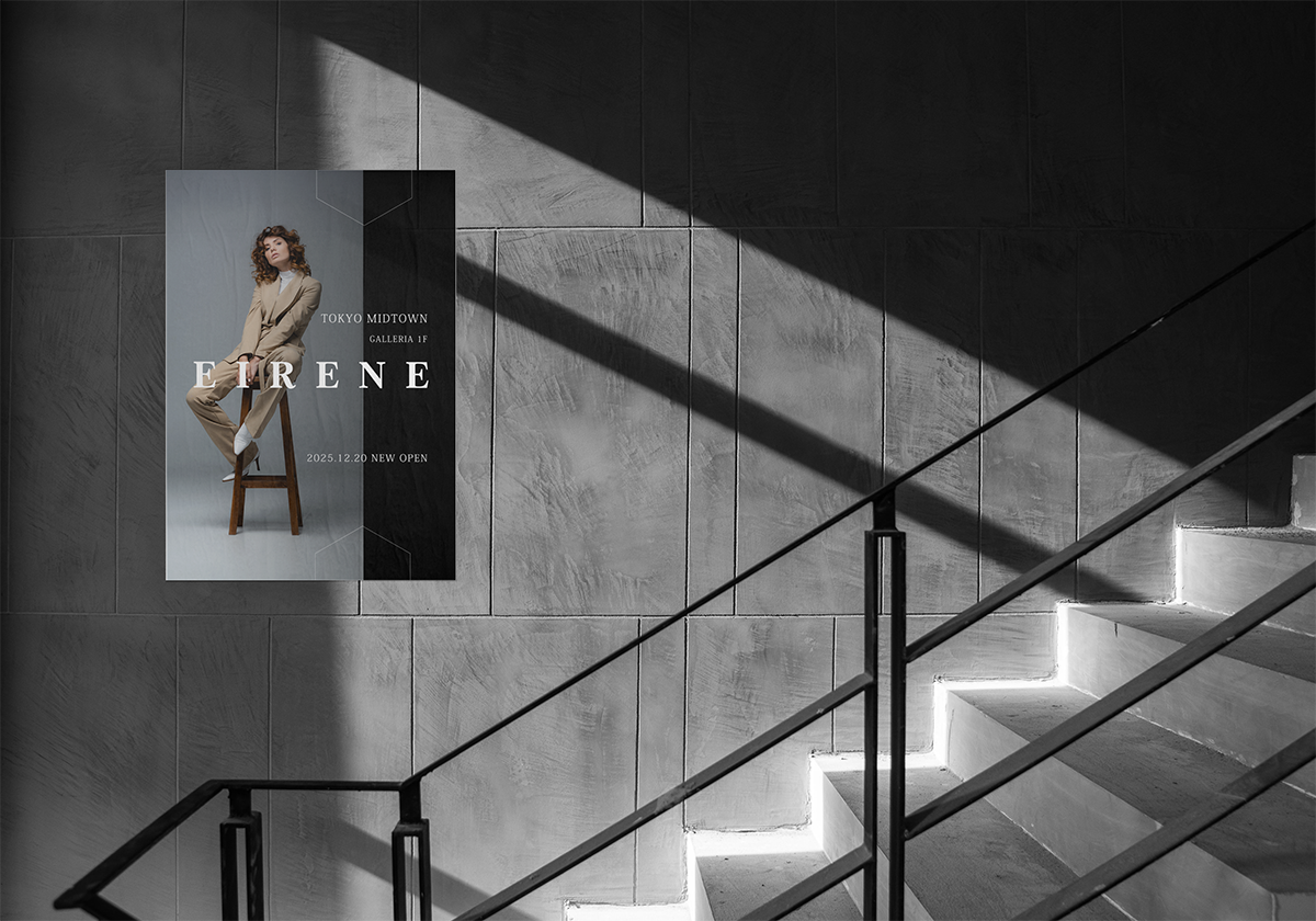 新しく立ち上げたキャリアウーマン向けスーツブランド「EIRENE」が、東京ミッドタウン ガレリア1Fにオープンするという設定で、キービジュアル用のポスターを制作しました。 |